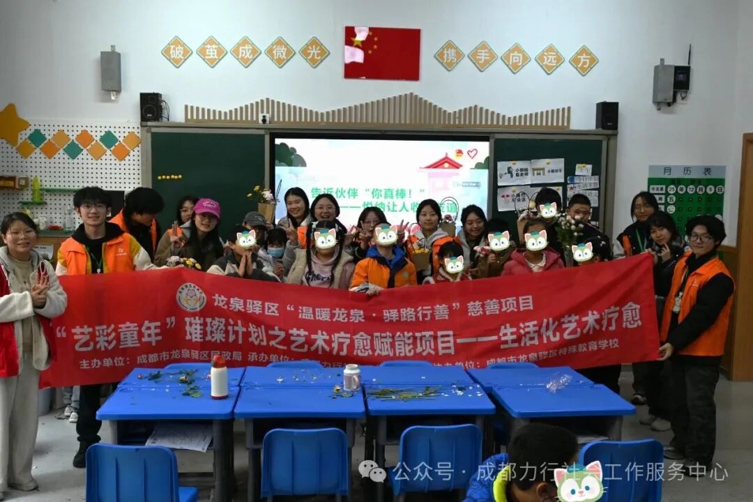 冬日的阳光透过玻璃窗,洒在龙泉驿区特殊教育学校的活动室里。2025年12月5日,一场由成都市龙泉驿区民政局主办,成都力行社会工作服务中心承办,成都市龙泉驿区特殊教育学校协办的“花语相伴·指尖生香”——花艺体验活动在孩子们的欢笑声中温情落幕。15名心智障碍儿童在志愿者的陪伴下,与花草相拥,在指尖创作中感受自然之美与成长之乐。