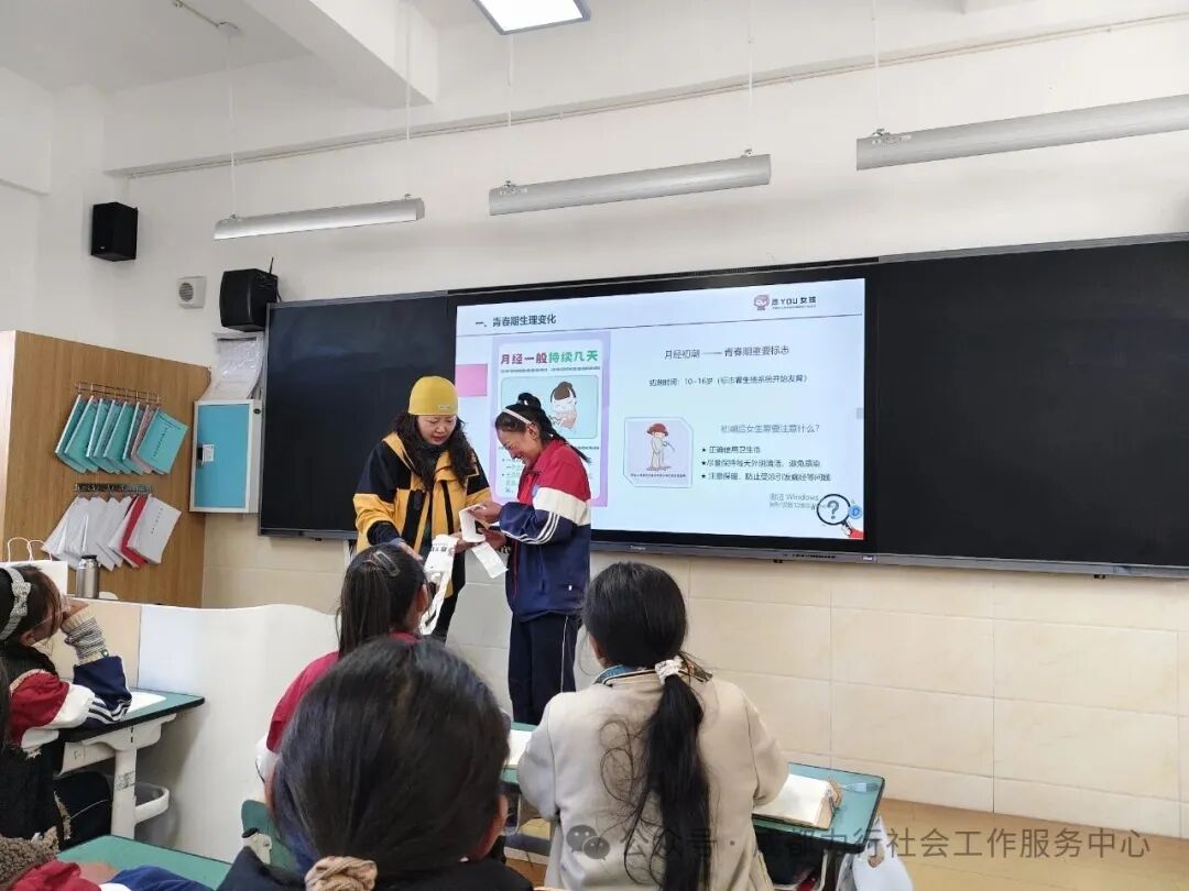 为让知识传递更精准、互动更充分,活动采用“小班化授课”模式。课堂上,讲师团队结合女生生长发育特点,以通俗语言搭配趣味动画短片、直观科普图片,系统讲解三大核心内容:一是详解青春期身体变化、月经健康护理要点,引导女生正确认识身体、养成良好卫生习惯;二是通过真实案例分析,教女生识别潜在危险、勇敢说“不”,掌握危险来临时的求助方法,提升自我防护能力;三是结合生活实际,介绍常见传染病的传播途径与预防措施,强调卫生习惯对健康的重要性。