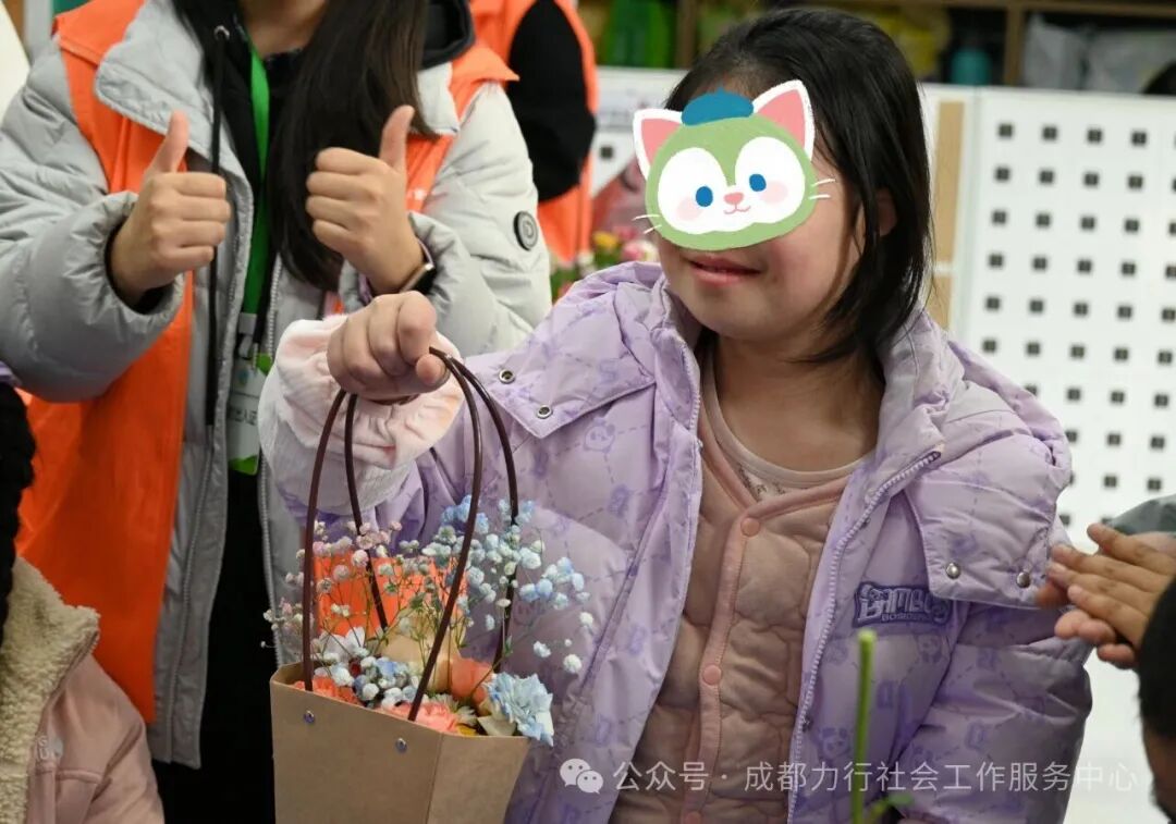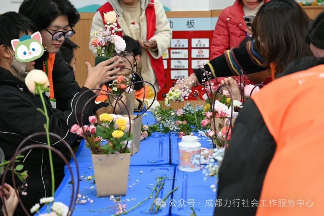 冬日的阳光透过玻璃窗,洒在龙泉驿区特殊教育学校的活动室里。2025年12月5日,一场由成都市龙泉驿区民政局主办,成都力行社会工作服务中心承办,成都市龙泉驿区特殊教育学校协办的“花语相伴·指尖生香”——花艺体验活动在孩子们的欢笑声中温情落幕。15名心智障碍儿童在志愿者的陪伴下,与花草相拥,在指尖创作中感受自然之美与成长之乐。